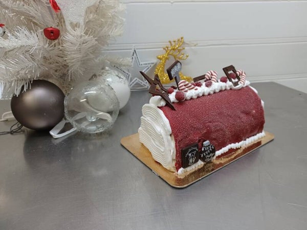 Busche met ijssmaak naar u keuze, overgoten met een frambooscoulis van verse frambozen afgewerkt met chocolade decoratie, suikerstokjes en rode bessen.
